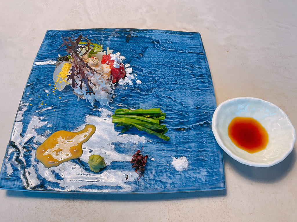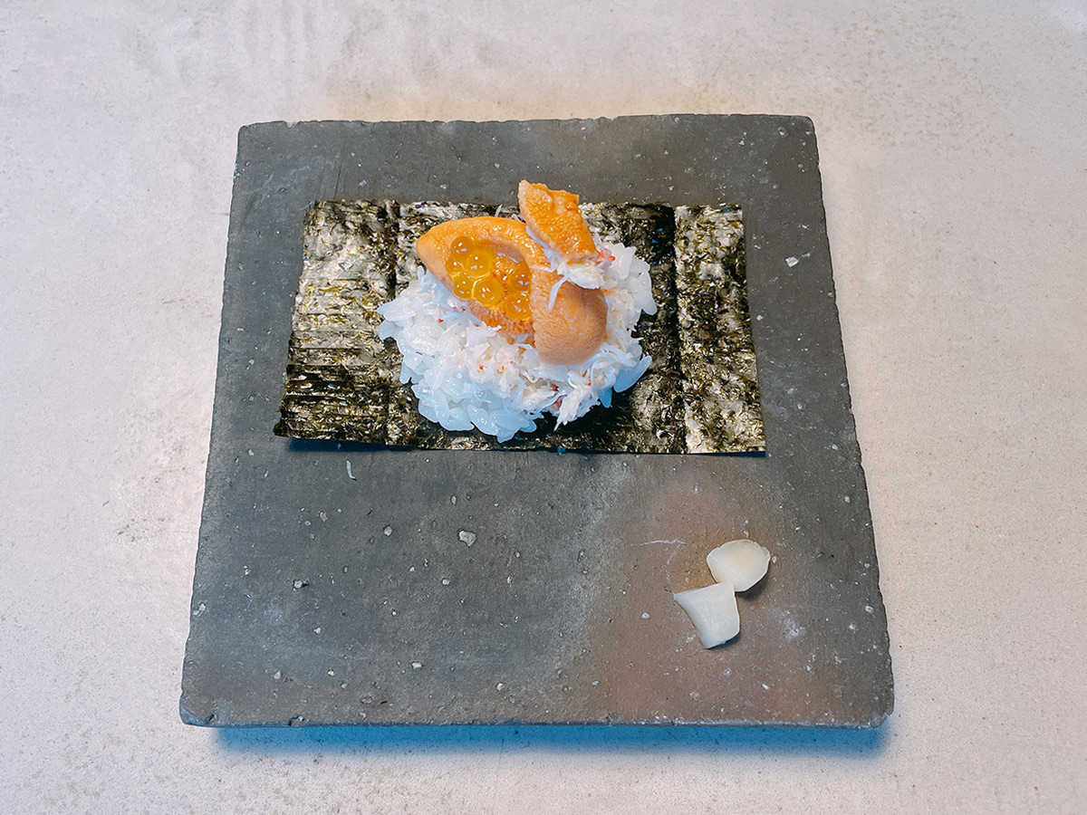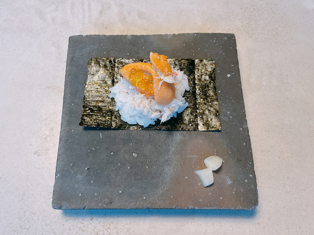 そして・・・!!!これです!!御凌ぎ 毛蟹うに 上のいくらに見えるのは・・ワサビ!