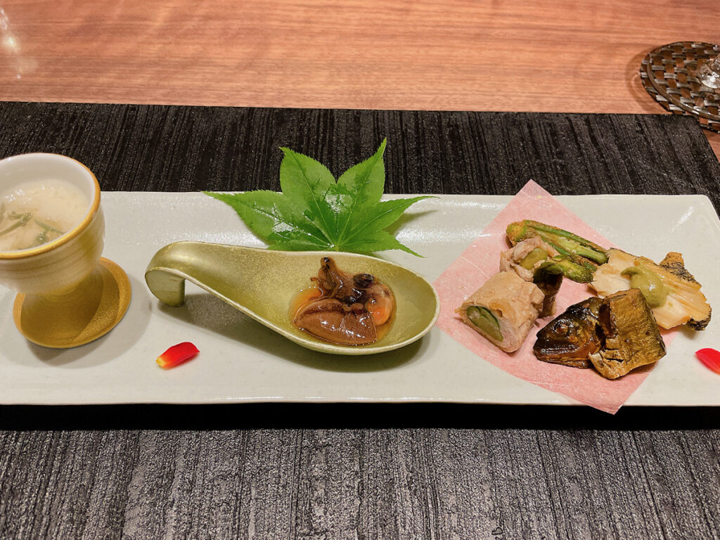 (前菜)盛り合わせ ホタルイカ、ジュンサイとろろ、アユの甘露煮、小オクラ、アワビ煮、豚アスパラ?(少し忘れ気味・・)