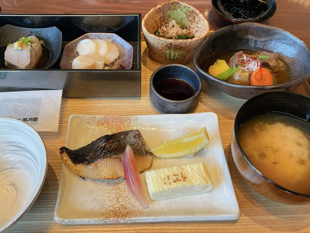 お刺身・黒大豆の豆腐・おひたし・だし巻き玉子・銀だら西京・牛筋大根・しじみのお味噌汁
