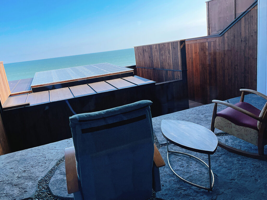 前の方に見えるのが露天風呂になっており、テラスから緩やかな階段折りて(ドラクエのダンジョンみたいだった・・・・)露天風呂があります。